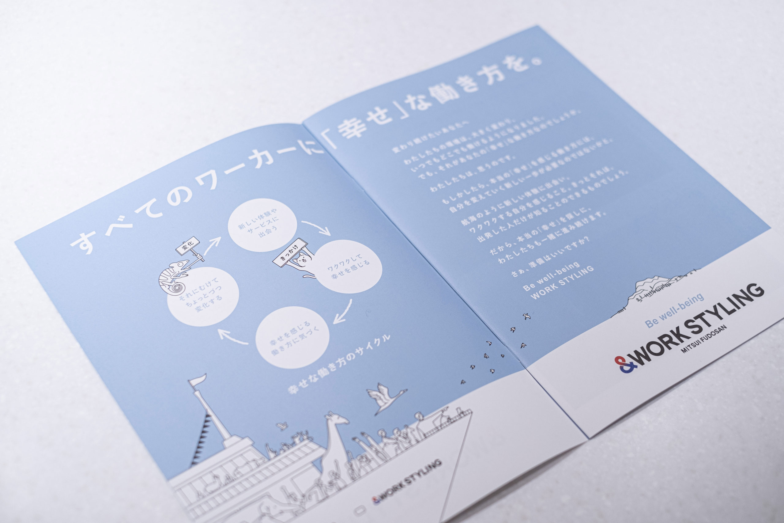 ワークスタイリングのパンフレットでは、すべてがパーパスにつながる世界観を表現。