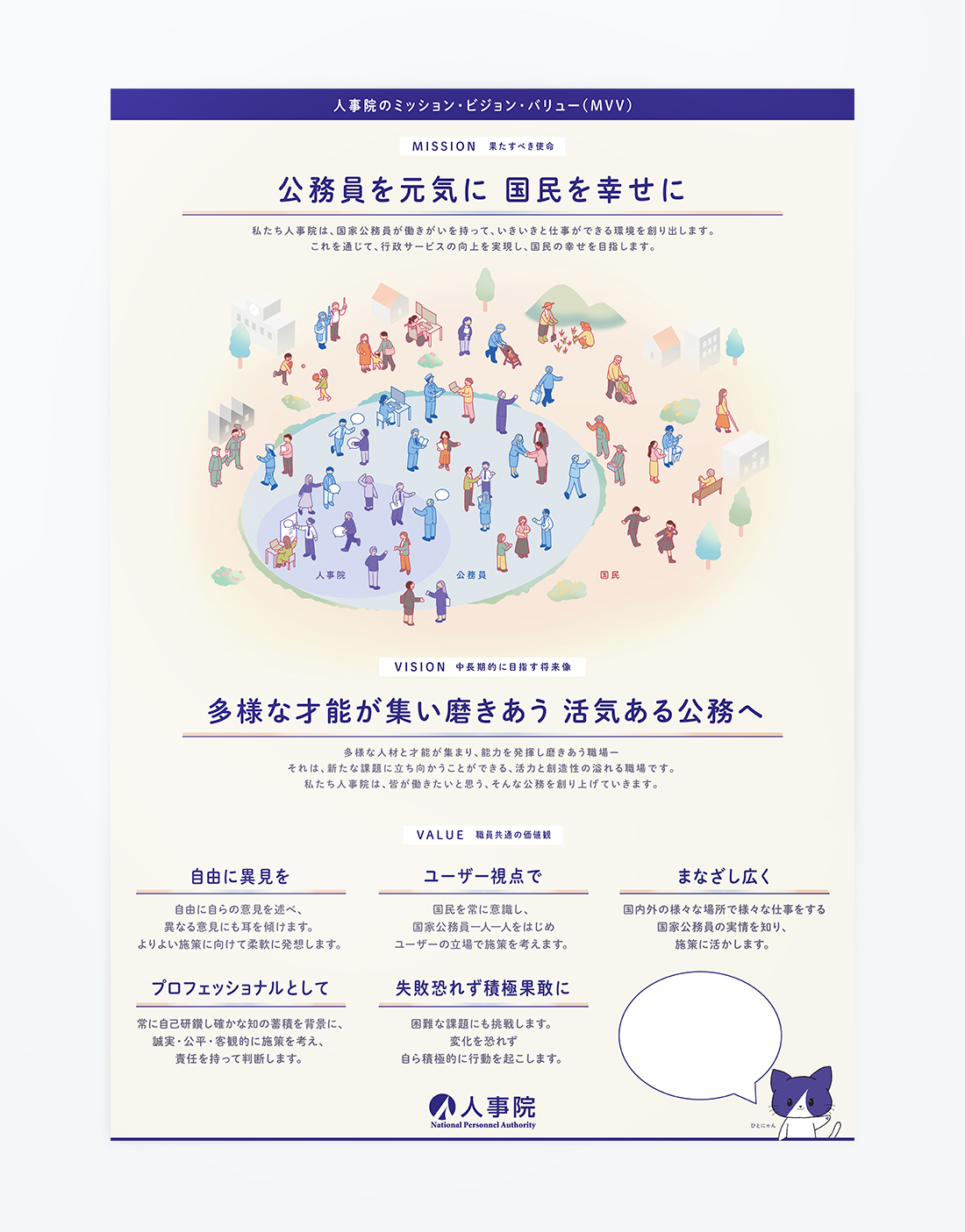 具体的なフレーズが決定したあと、その世界観を表現するイラストをBIOTOPEとともに作成しました。こちらも多様な意見があり、それらをとりまとめるのは簡単ではなかったのですが、完成したイラストにはとても満足しています。人事院と公務員、さらに国民も一枚絵の中に配置されていて、わたしたちの仕事が最終的には国民ともつながっていることが視覚的に表現されています。このイラストはポスターにして院内各所に掲示されています。
